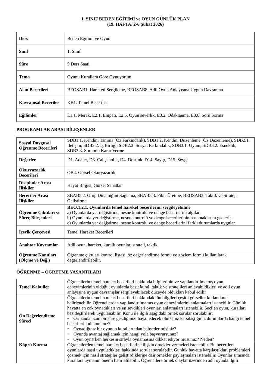 1. sınıf Beden Eğitimi ve Oyun dersi 19. hafta günlük planı. 2–6 Şubat 2026 tarihleri için hazırlanmıştır. Kurallı oyunlar, temel hareket becerileri, adil oyun anlayışı ve oyun temelli etkinlikler içerir.