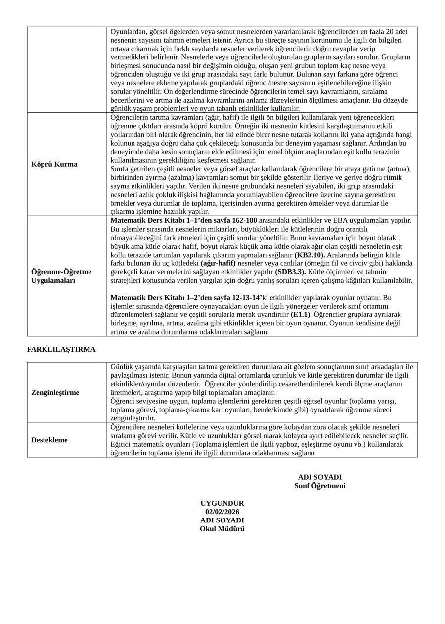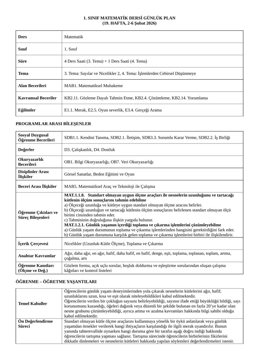 1. Sınıf Matematik Dersi 19. Hafta Günlük Planı (2–6 Şubat 2026)