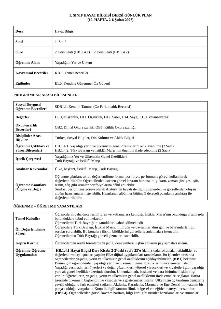 1. sınıf Hayat Bilgisi dersi 19. hafta günlük planı. 2–6 Şubat 2026 tarihleri için hazırlanmıştır. Yaşadığım Yer ve Ülkem konusu, Türk Bayrağı ve İstiklâl Marşı kazanımlarını içerir.