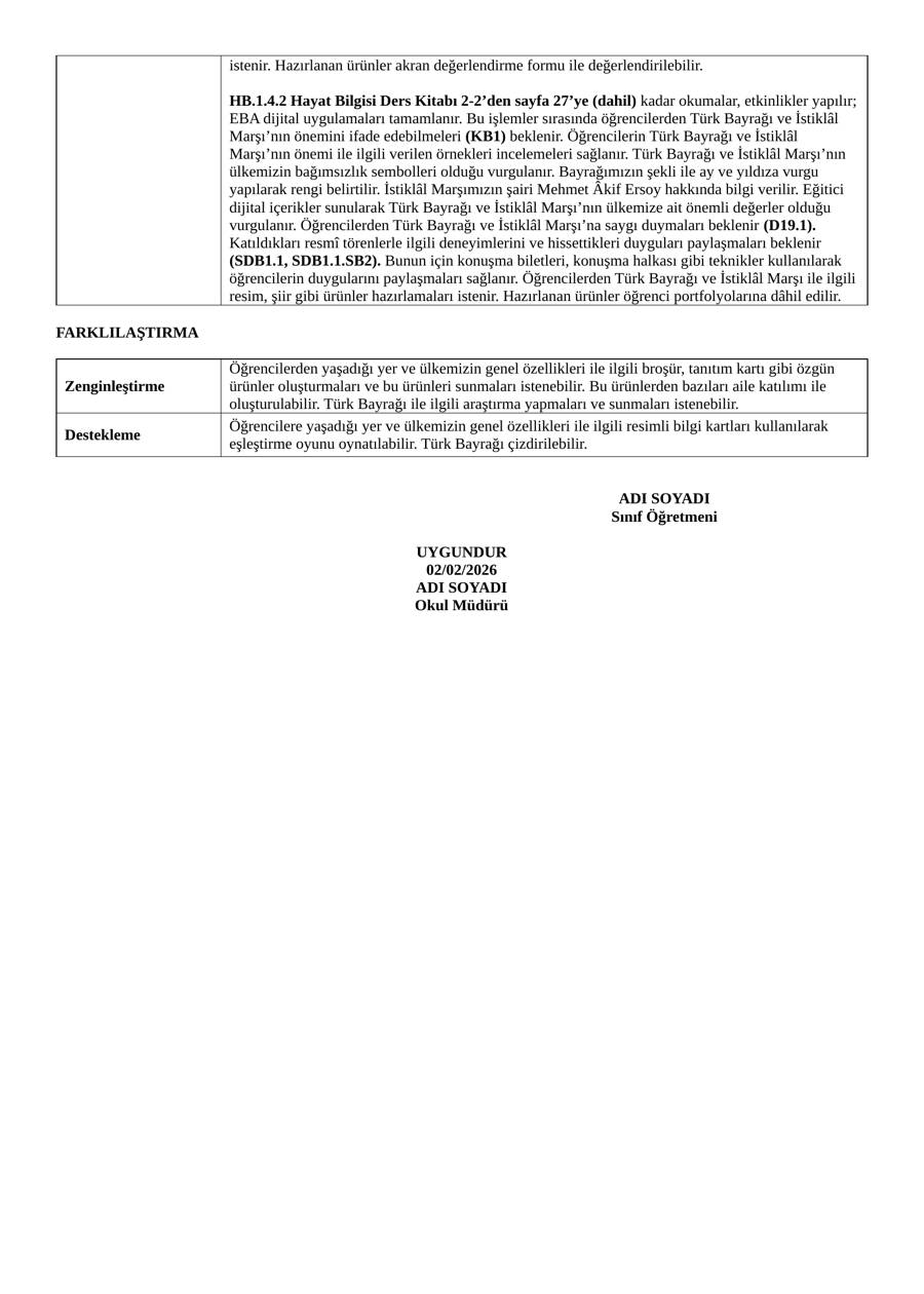 1. sınıf 20. hafta hayat bilgisi günlük planı. 9–13 Şubat 2026 tarihli, TYMM uyumlu, Türk Bayrağı ve İstiklâl Marşı kazanımlarını içeren Word dosyası.